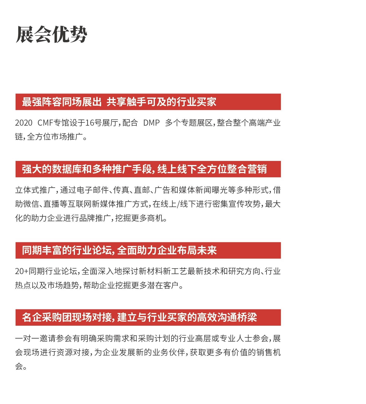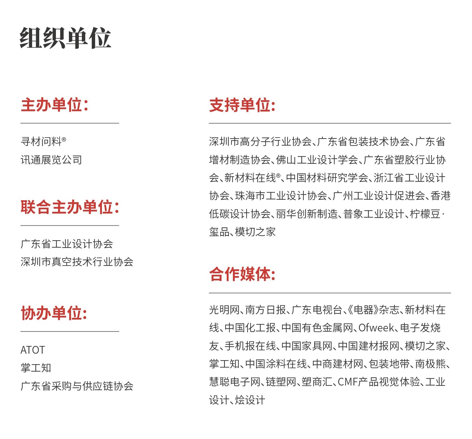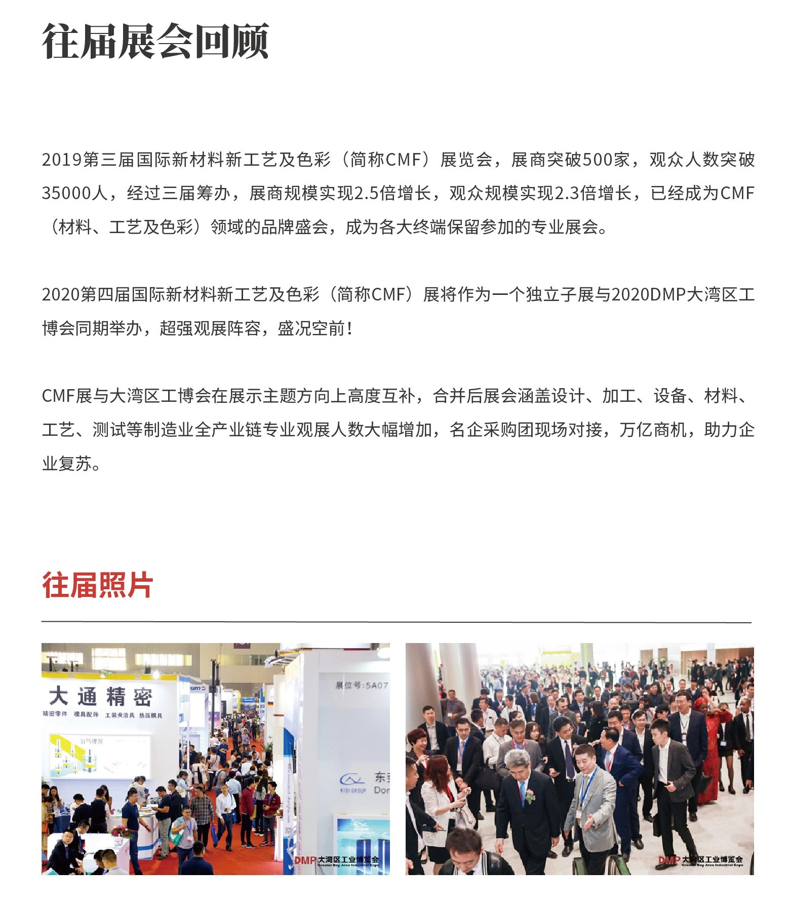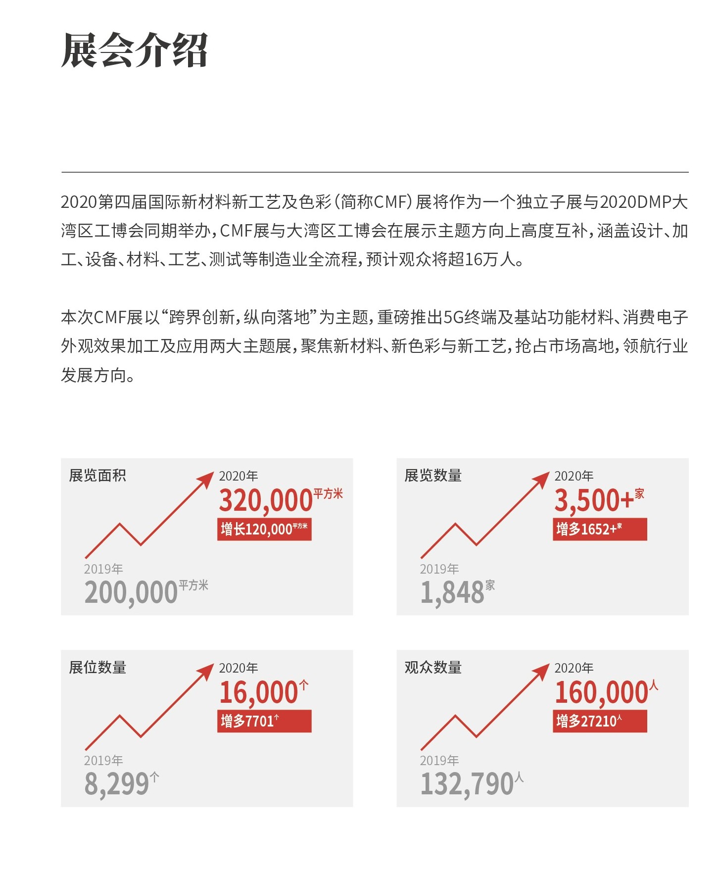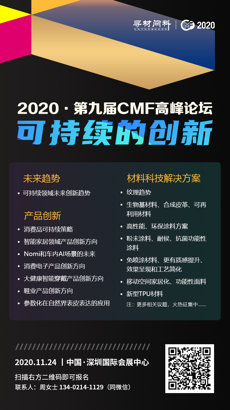 2020年11月24-27日,寻材问料®将携手全球知名品牌终端、设计机构、材料企业、加工制造、设备厂商在中国·深圳国际会展中心举办2020年第四届国际新材料新工艺及色彩(简称CMF)展览会,本次展会将作为一个独立子展与2020DMP大湾区工博会同期举办,展会为期4天,展览面积达32万平米,预计观展人数高达160000人。